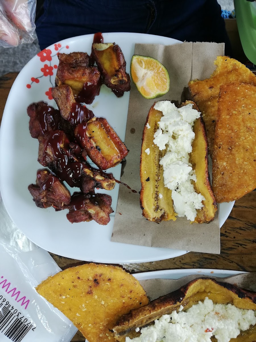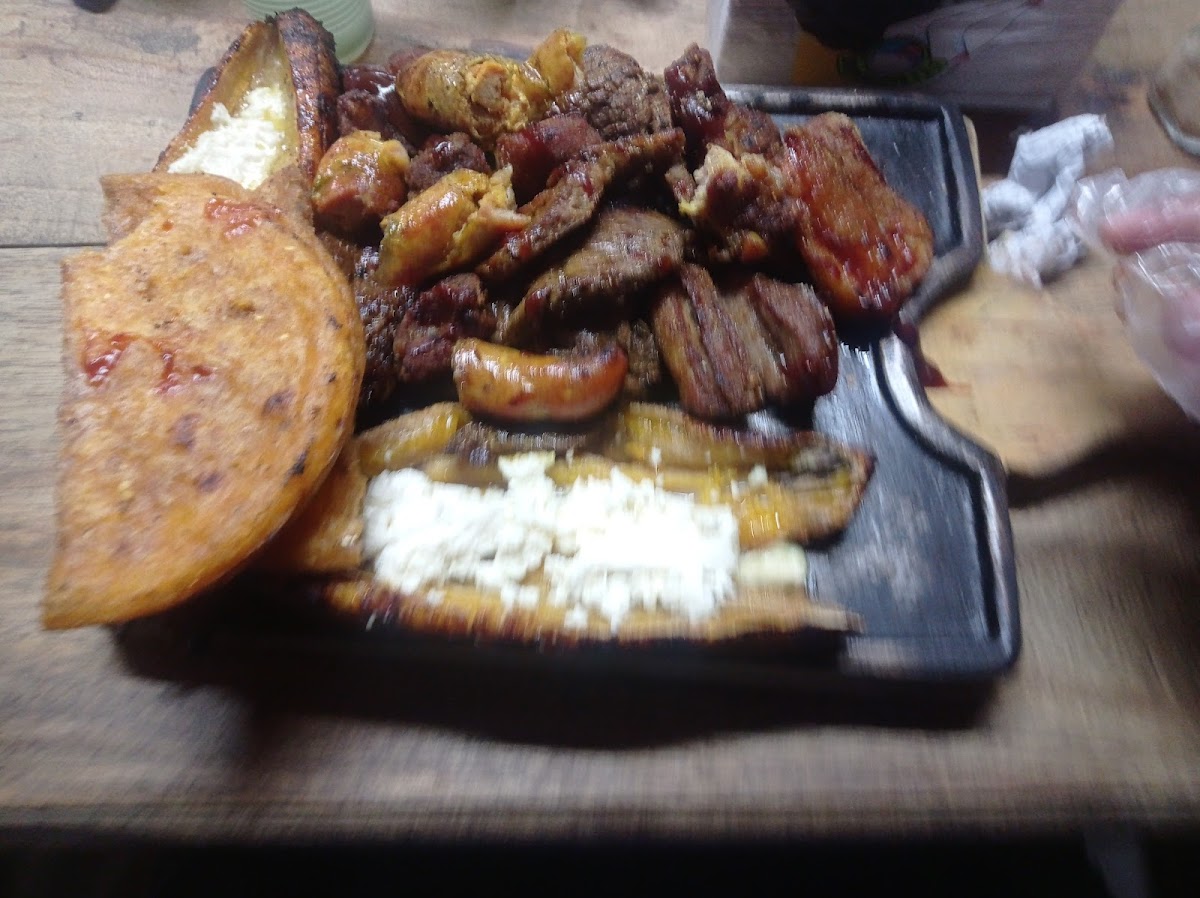 Excelente comida en especial deliciosos chorizos, plátano asado y picadas de carne